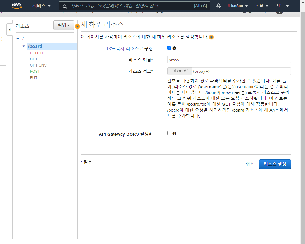 그리고 Resource Path에 {proxy+}라고 적어준다. 그리고 Resource Name에는 proxy라고 적어준다.