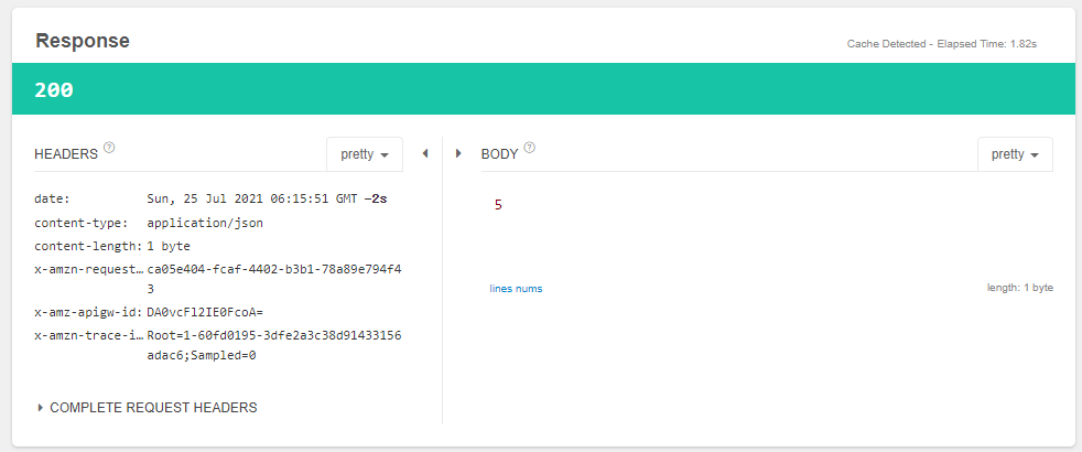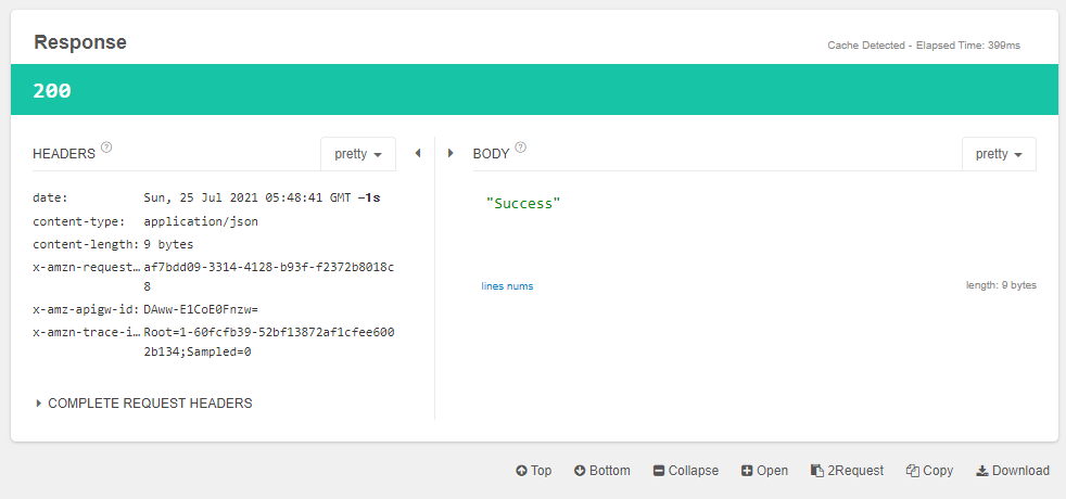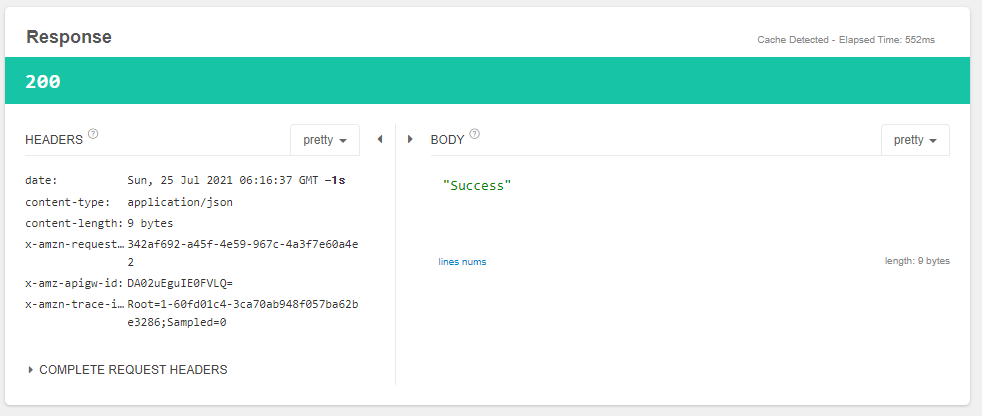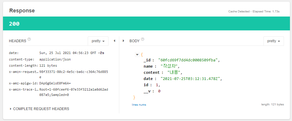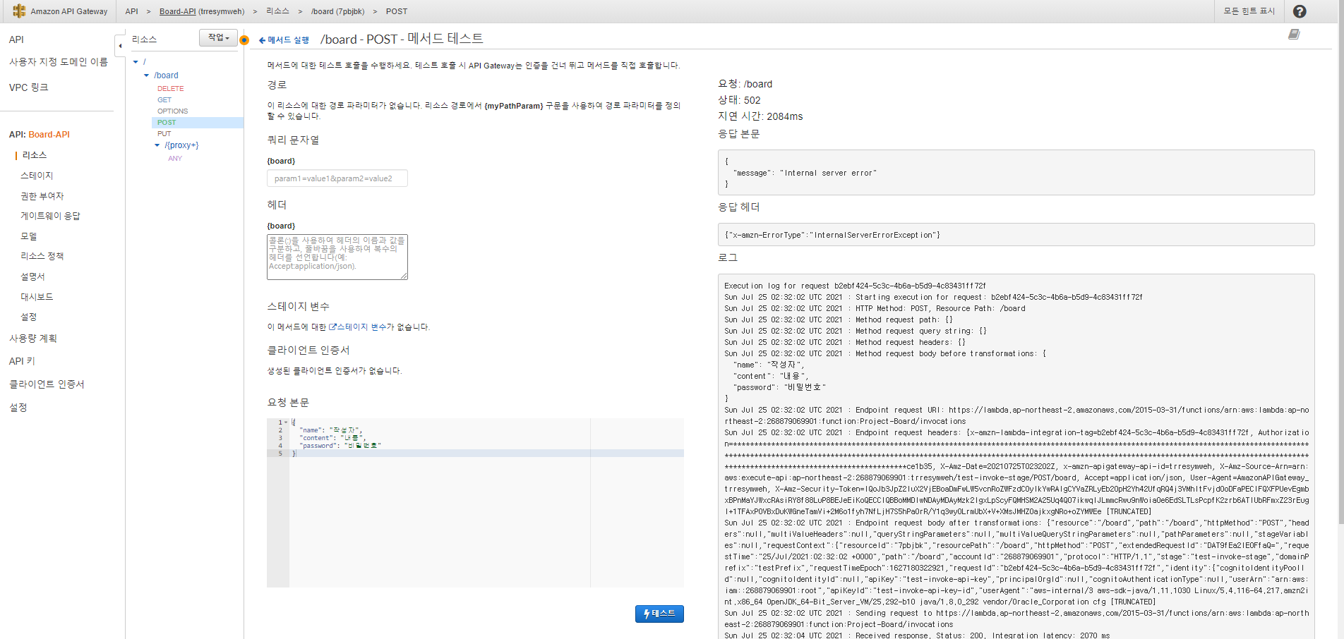 마찬가지로 API gateway에서 테스트 하는 부분에서 Request Body를 기존의 데이터로 설정해서 테스트를 해보면 정상적으로