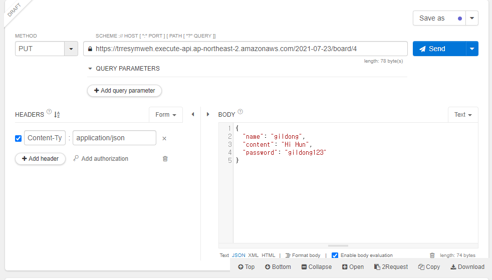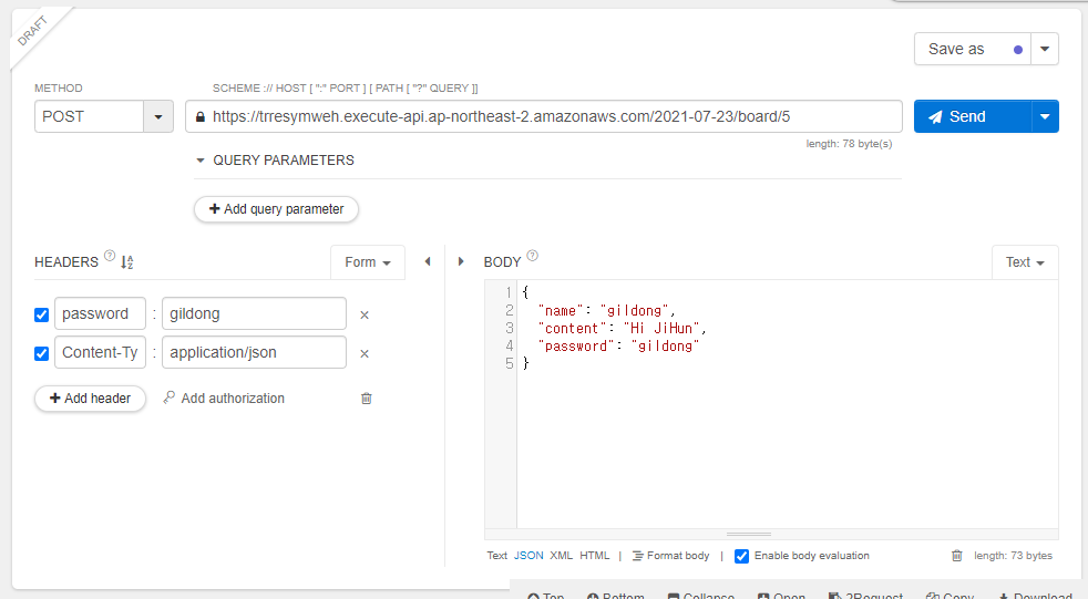 찾고자하는 그 정보는 해당 id 값과 name,content,password를 다음 parameter로 넣어서 해당 id 값의 게시물의 name, content, password를