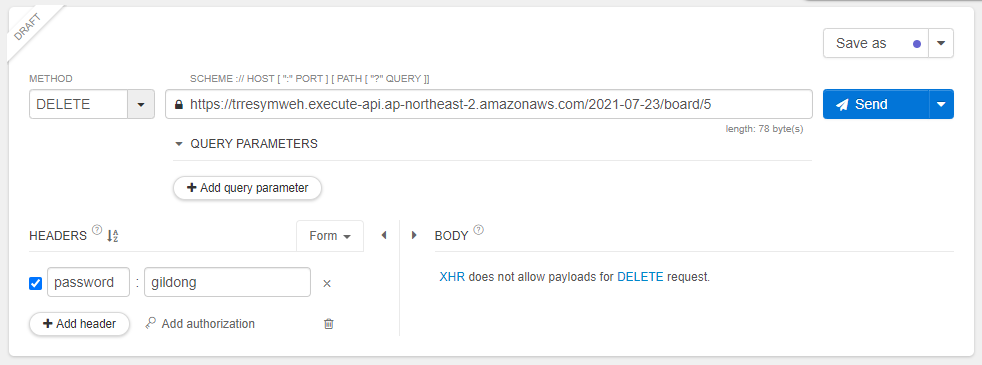 DELETE 같은 경우는 지우고자하는 경로에 해당하는 id 값을 넣어주고 헤더에는 password로 현재 password를 넣어주게 되면