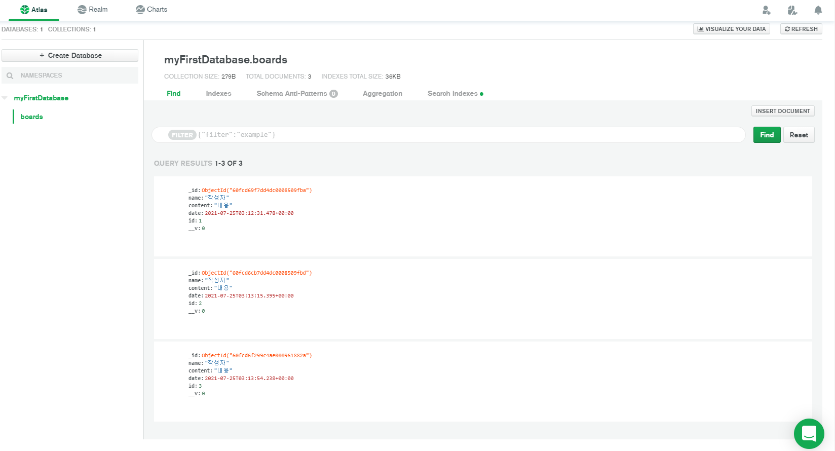 다시 한번 mongoDB에 들어가 있는 데이터를 새로고침 해서 확인해보면 정상적으로 등록한 데이터가 잘들어가있는것을 확인할 수 있다.