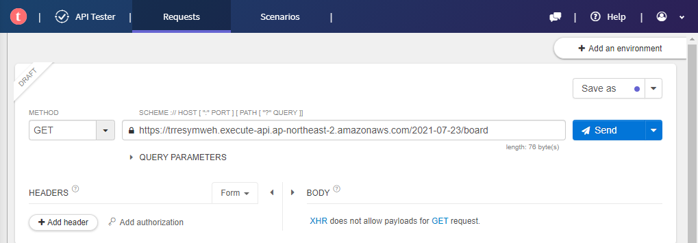 이를 GET 방식으로 TEST 하면 오류가 발생한다. 이럴때는 마찬가지로 다시 API gateway로 가서 GET 방식으로 다시 TEST를 수행하면 된다.