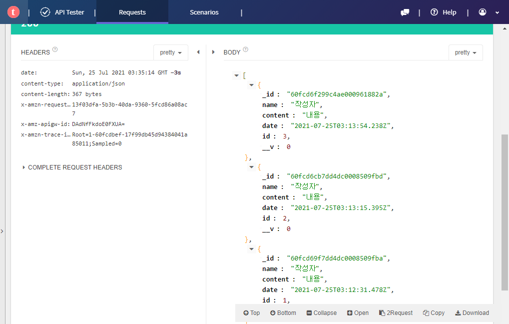 이와 같이 POST 방식의 함수 즉 데이터의 삽입 API는 구현이 완료된 것이다.