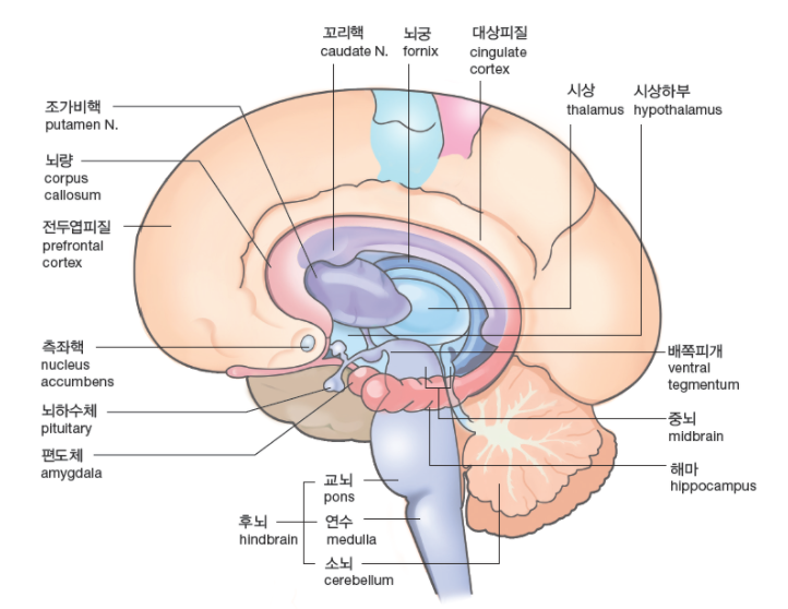 시상 : 많은 신경핵들로 이루어져 있으며 대부분의 감각 신경이 지나가는 통로 -> 뇌에서 가장 중요한 역할 담당