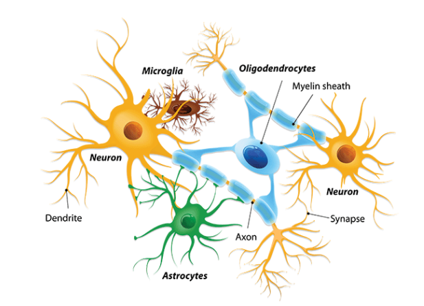 - Gila : 뇌를 유지하는 보조 세포, 시냅스 상호작용과 전기 시그널에는 관여하지 않으며, neurotransmittet 등을 관장합니다.