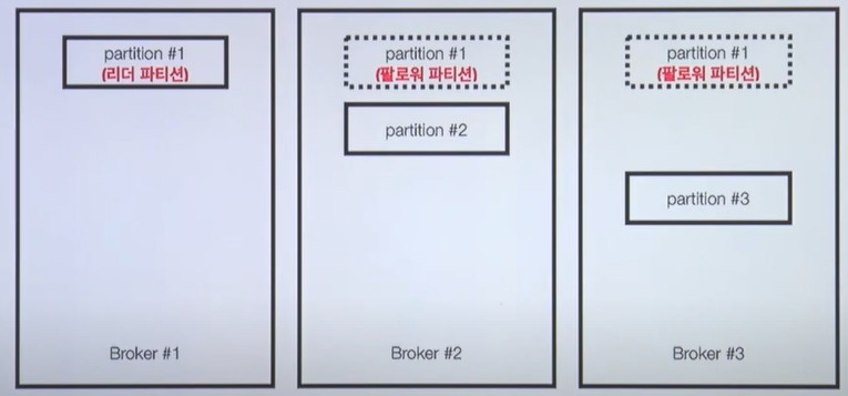 - 팔로워 파티션 : 리더 파티션으로부터 레코드를 지속 복제(복제하는 시간이 걸림). 리더 파티션의 동작이 불가능할 경우 나머지 팔로워 중 1개가 리더로 선출됨