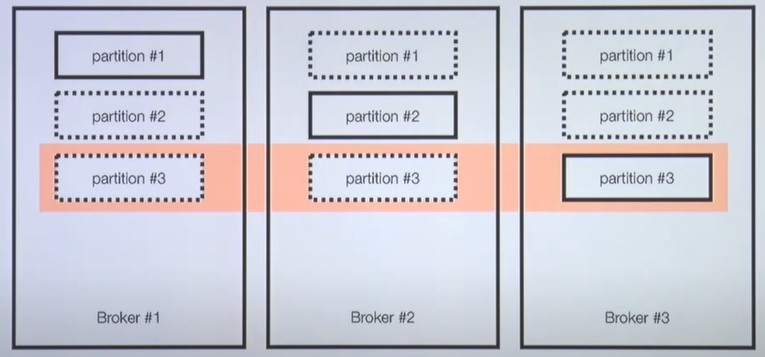 - 파티션 3개, 레플리케이션이 3개로 이루어진 토픽이 브로커에 할당된 모습