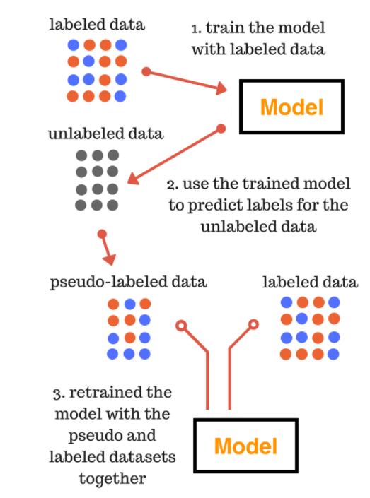 Pseudo-labeled data와 Labeled를 모두 사용하여 다시 그 모델을 학습시킨다.