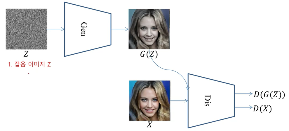 잡음의 이미지로부터 무엇인가를 생성해낸 결과에 대해서 분류기라고 하는 Dis가 G(Z)를 가짜라고