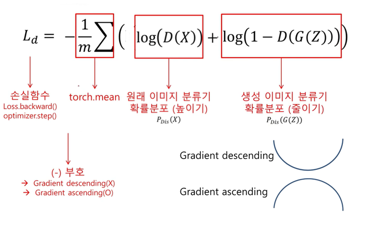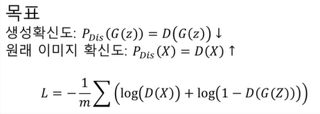 - 두 분류 결과 (1:생성이미지 D(G(Z)), 2:원래이미지 D(X)) 1번에 대해서는 가짜, 2번에 대해서는 진짜로 분류하게끔 학습 목표를 제공해주어야 하는 것이 알고리즘의 총흐름도