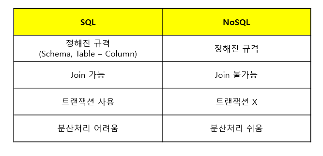 - 스키마가 없다. 즉 데이터 관계와 정해진 규격(table - column의 정의)이 없다.