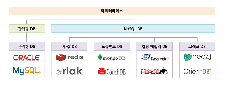 - 아래 그림은 관계형 데이터베이스와 4가지 종류의 NoSQL 데이터베이스를 각각의 대표 제품과 함께 나타낸 그림이다.