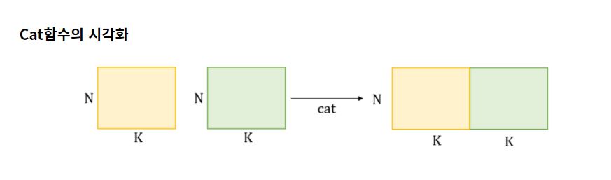 cat함수는 concatenate를 해주는 함수이고 concatenate하고자 하는 차원을 증가시킨다. concatenate하고자하는 차원을 지정해주면 그 차원으로 두 tensor의 차원을 더한 값으로 차원이 변경된다.
