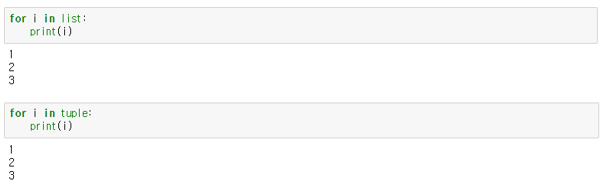 3.list와 tuple 모두 iterable하다. 즉, for문을 넣고 돌릴 수 있다.