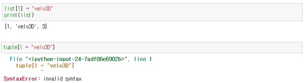 이 특징은 리스트와 튜플을 구분하는 유일한 기술적 차이점이지만 이 특징이 나타나는 부분은 여럿 존재한다. 예를 들면 리스트에는 .append() 메소드를 사용해서 새로운 요소를 추가할 수 있지만 튜플은 불가능하다.