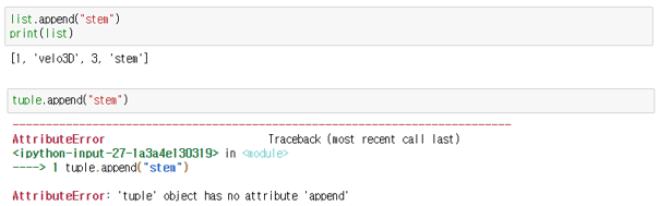 튜플은 .append() 메소드가 필요하지 않다. 튜플은 수정할 수 없기 때문이다.