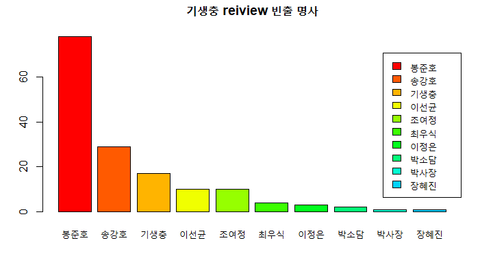 # barplot을 그린 결과, dic을 사전으로한 review에서는 봉준호 감독에 대한 언급이 가장 많았고