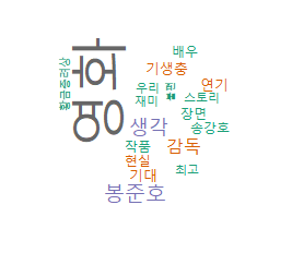명사만 추출하여 워드클라우드를 시각화 했다. 봉준호 감독에 대한 명사(봉준호, 감독 등)에 대한 단어와