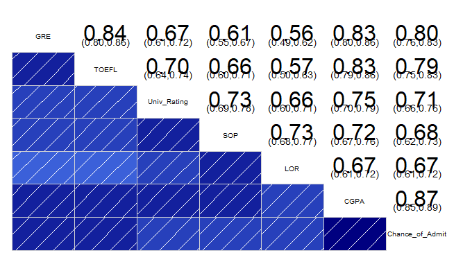 corrgram(adms[,-7], upper.panel = panel.conf)