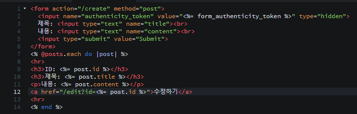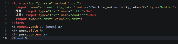 그리고 do end 사이에 여기에 post를 입력하면 post(게시물 하나)를 쓸 수가 있다.